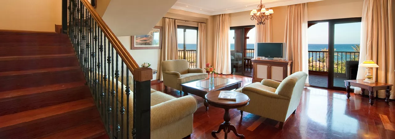 Juniorsuiten: ca. 70 qm, Bad mit Sprudelbadewanne, begehbarer Schrank und Balkon oder Terrasse mit Garten- oder Meerblick.