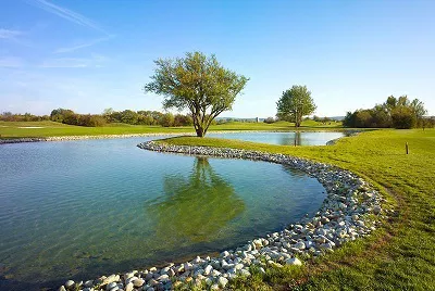 Der Diamond Country Club - Atzenbrugg (2002) liegt im Niederösterreichischen Tullnerfeld südlich der Donau, knapp 50 km von Wien entfernt. Der Diamond Country Club umfaßt insgesamt 3 Golfplätze. Das Herzstück der Anlage ist der Diamond Course, ein 18-Loch Championship Kurs, der von Jeremy Pern entworfen wurde. Zusätzlich stehen ein 9-Loch Park Course und der 7-Loch Country Course, welcher derzeit auf 18-Loch erweitert wird, zur Verfügung. Integriert in den Verlauf der Bahnen ist der zentral gelegene 10 ha große See. | |