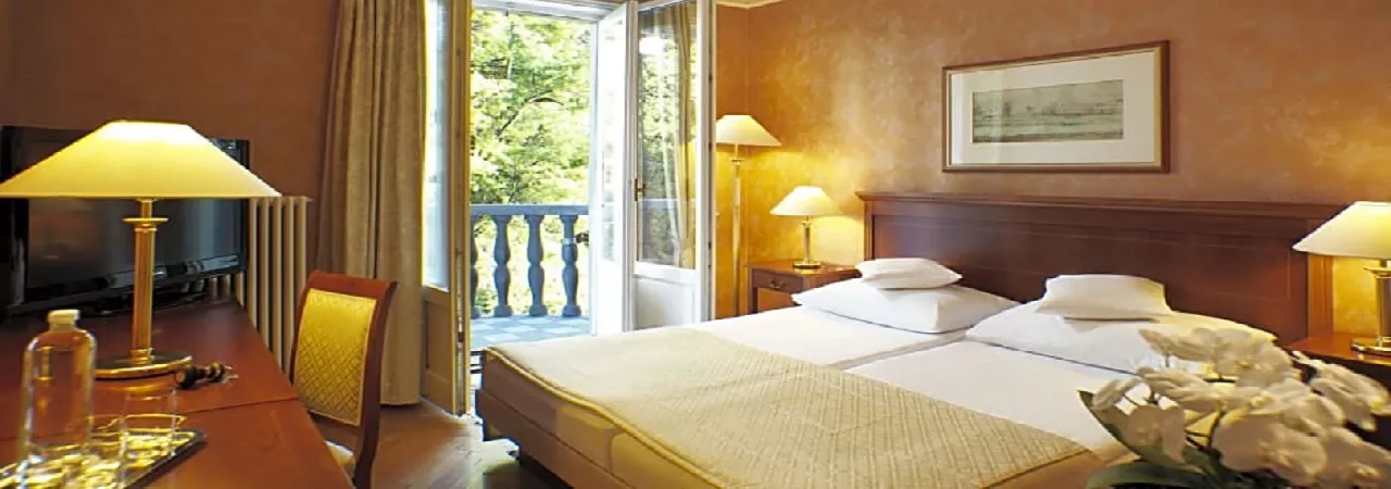 Elegantes Doppelzimmer mit Balkon in einem für das Hotel charakteristischen traditionellen und luxuriösen Stil. Im Zimmer befindet sich ein Bett der Größe 180 cm, ein Badezimmer mit Badewanne oder Dusche und WC sowie ein Schreibtisch.